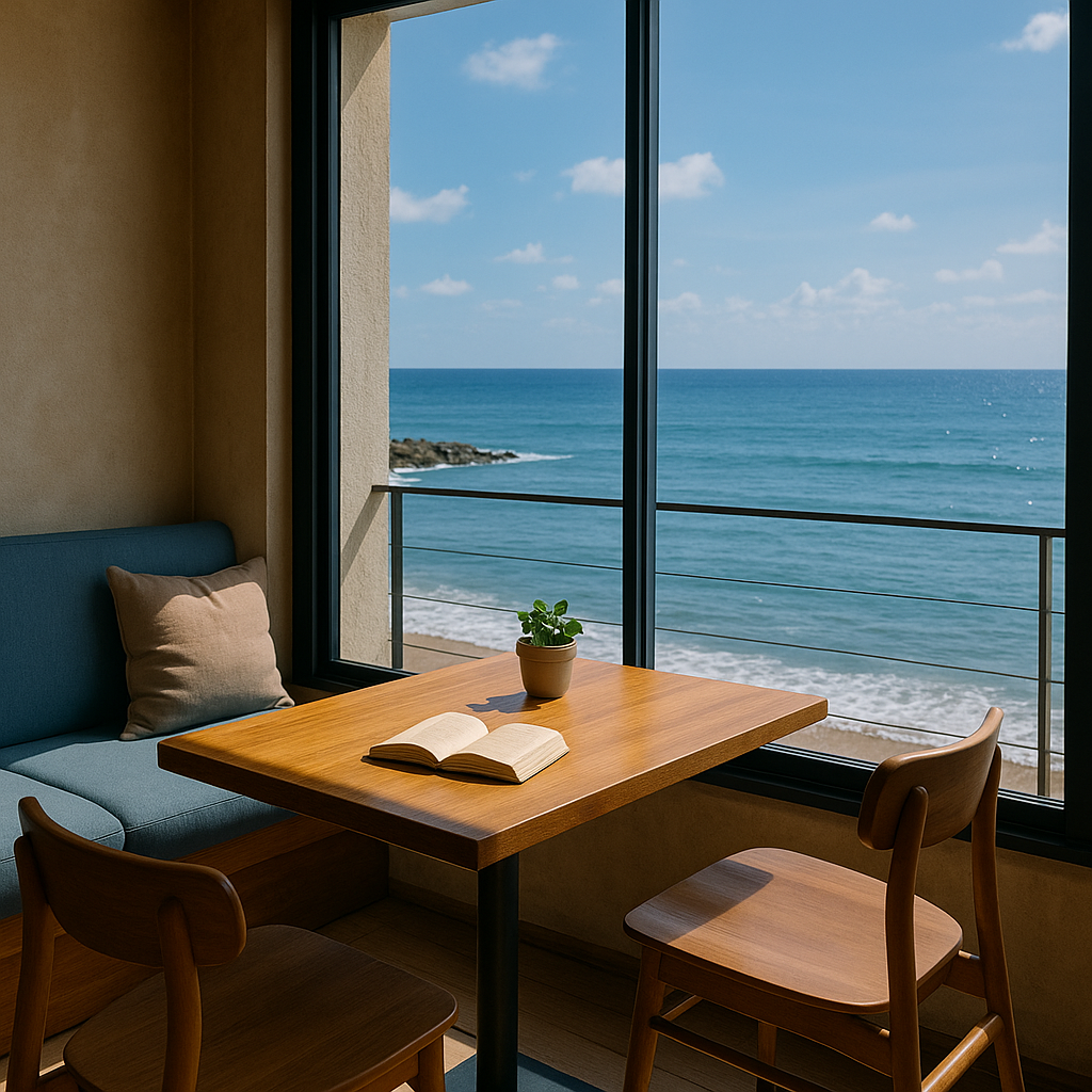 大片落地窗迎接藍天與海浪,陽光灑落在木質桌面上。 在這裡,可以看書、談天、放空,讓心情隨海的節奏慢慢流動。